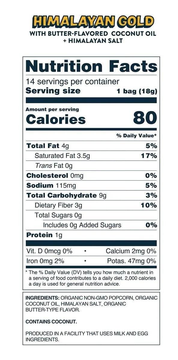 Enjoy the deliciously light and crispy Lesser Evil Popcorn Himalayan Gold. Made with organic coconut oil and seasoned with pure Himalayan salt, it's a tasty treat that contains no vegetable oils. With only 80 calories per serving and completely gluten-free, it’s a happy snack you can feel good about anytime.